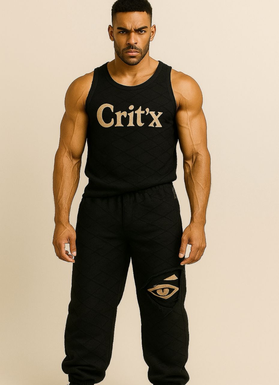 Elevate your street wear game with this stylish CritX Tracksuit. Crafted from premium, breathable fabric, this set features a sleeveless tank top with bold CritX lettering and matching joggers with a unique eye graphic and distressed detail on the thigh. Perfect for casual outings or gym sessions, the lightweight design and comfortable fit are complemented by sleek, coordinating sneakers. Available in a versatile beige tone.