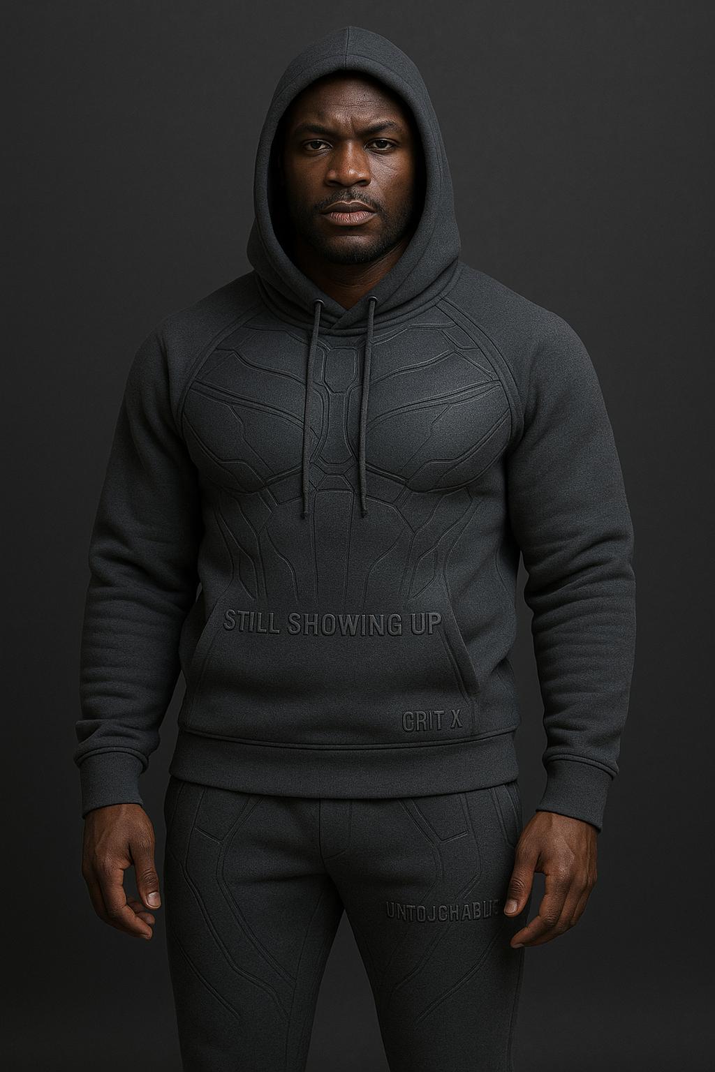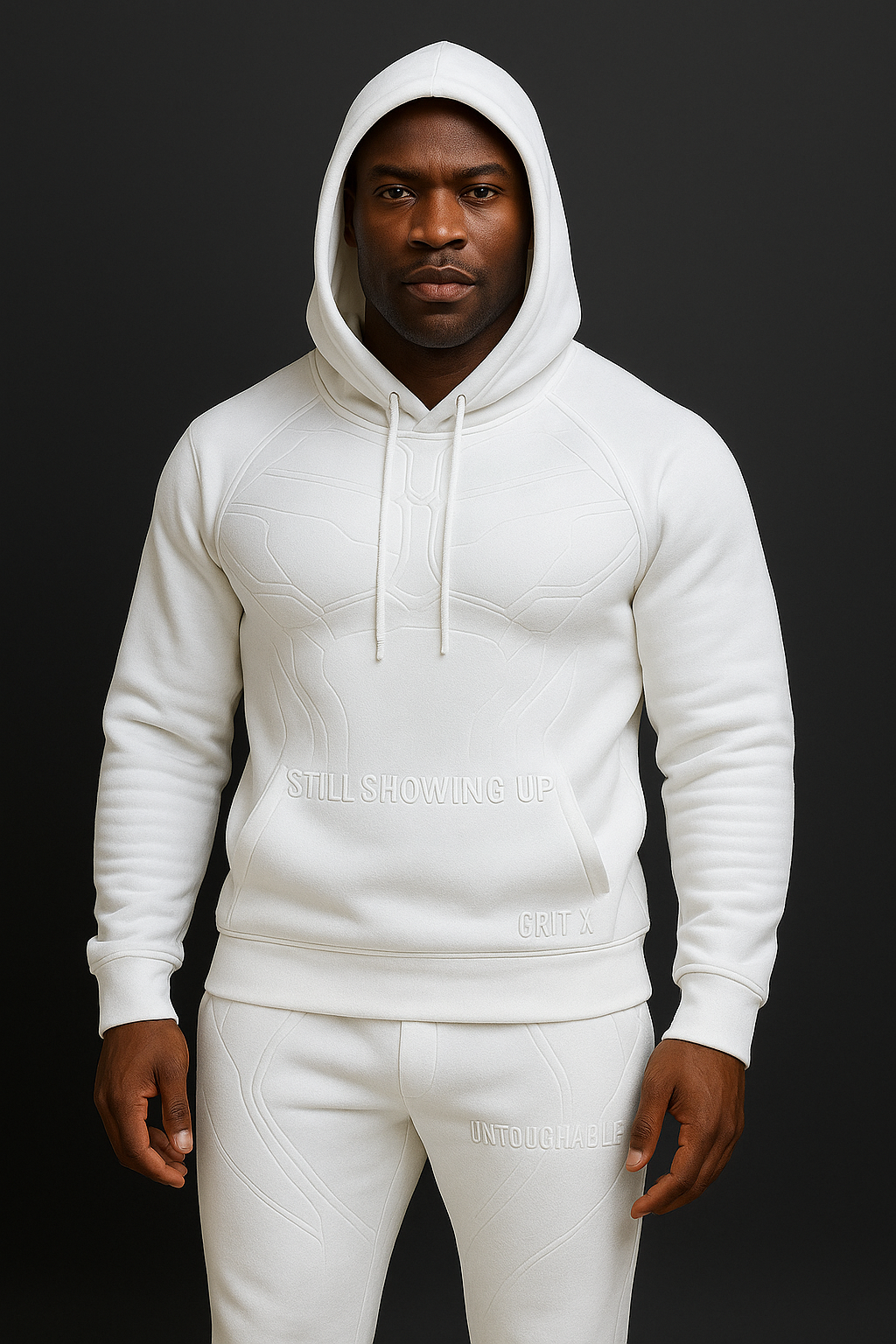 - Embossed messaging: “STILL SHOWING UP” (hoodie), “UNTOUCHABLE” (joggers)