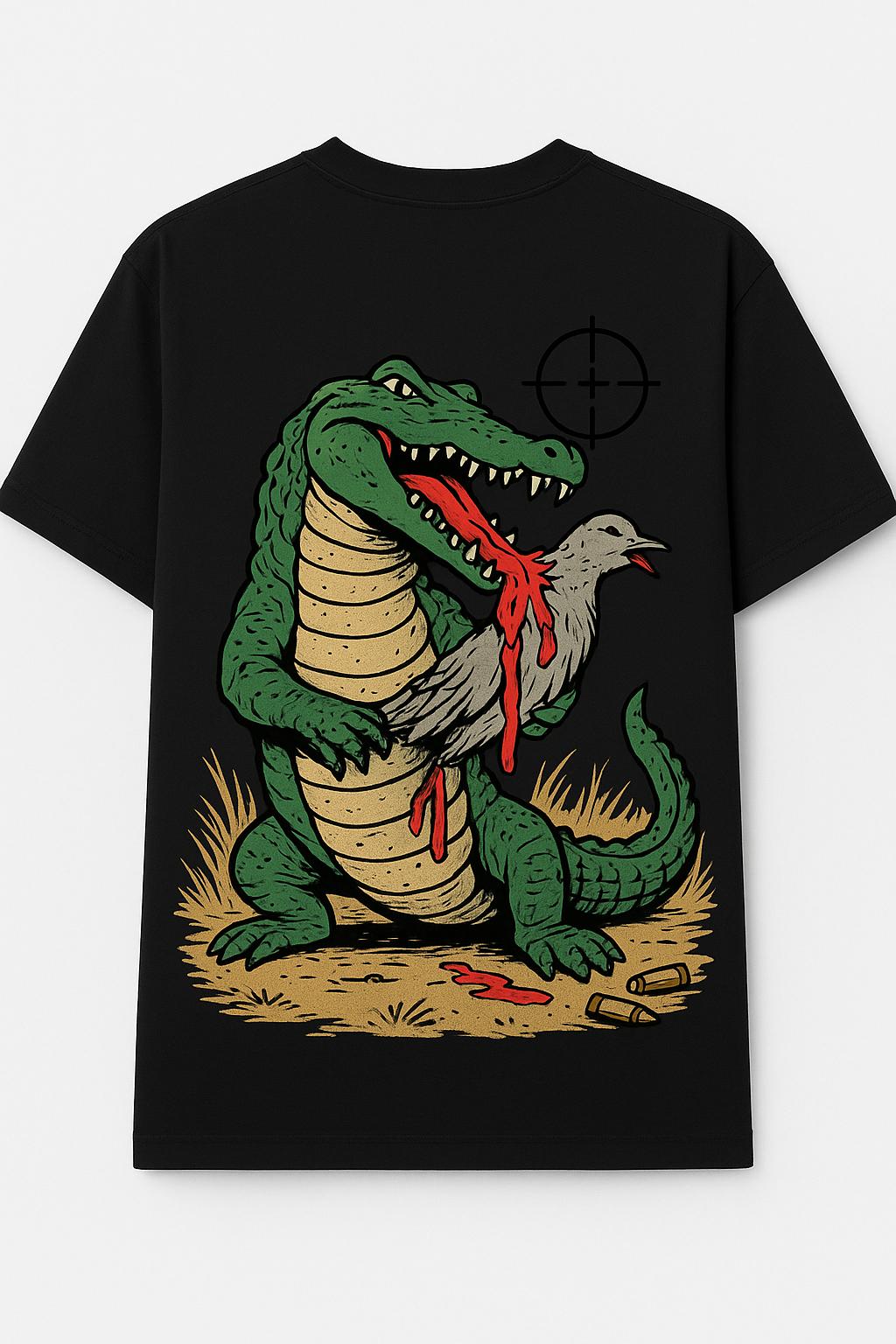 Unleash your wild side with the Predator’s Feast T-Shirt, a bold statement piece designed for those who embrace the untamed. This striking black tee features an eye-catching graphic of a fierce alligator devouring a bird, set against a rugged, earthy backdrop. Perfect for street wear enthusiasts and nature lovers alike, this shirt combines edgy art with comfortable wear.